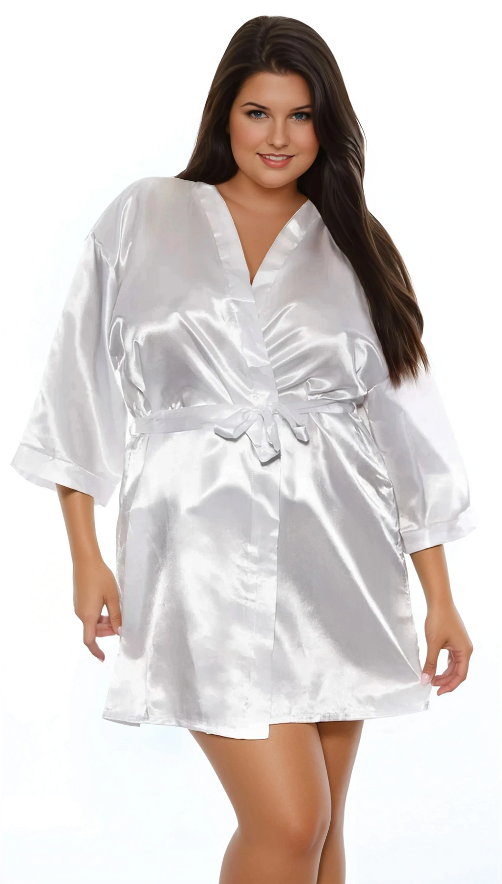 Achieve elegant comfort in our unisex Satin Kimono Plus - Size Robe. Crafted with short draping sleeves and accompanied by a matching sash, this robe ensures both sophistication and relaxation.